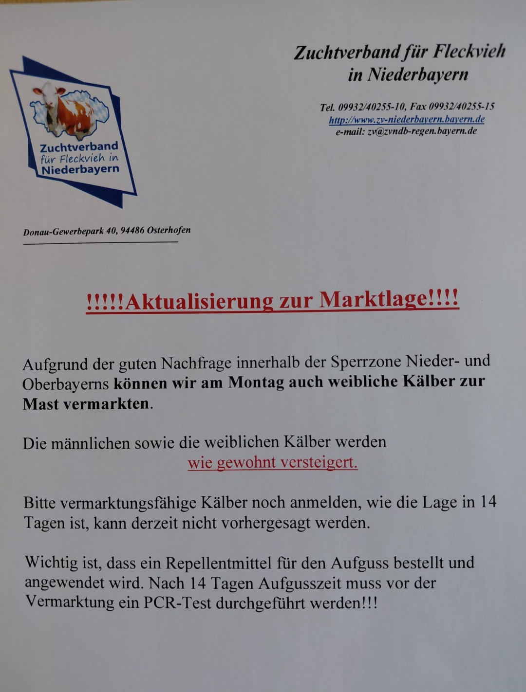 Die nächste Zuchtviehversteigerung findet in Osterhofen am Mittwoch, den 14. September 2022 statt.