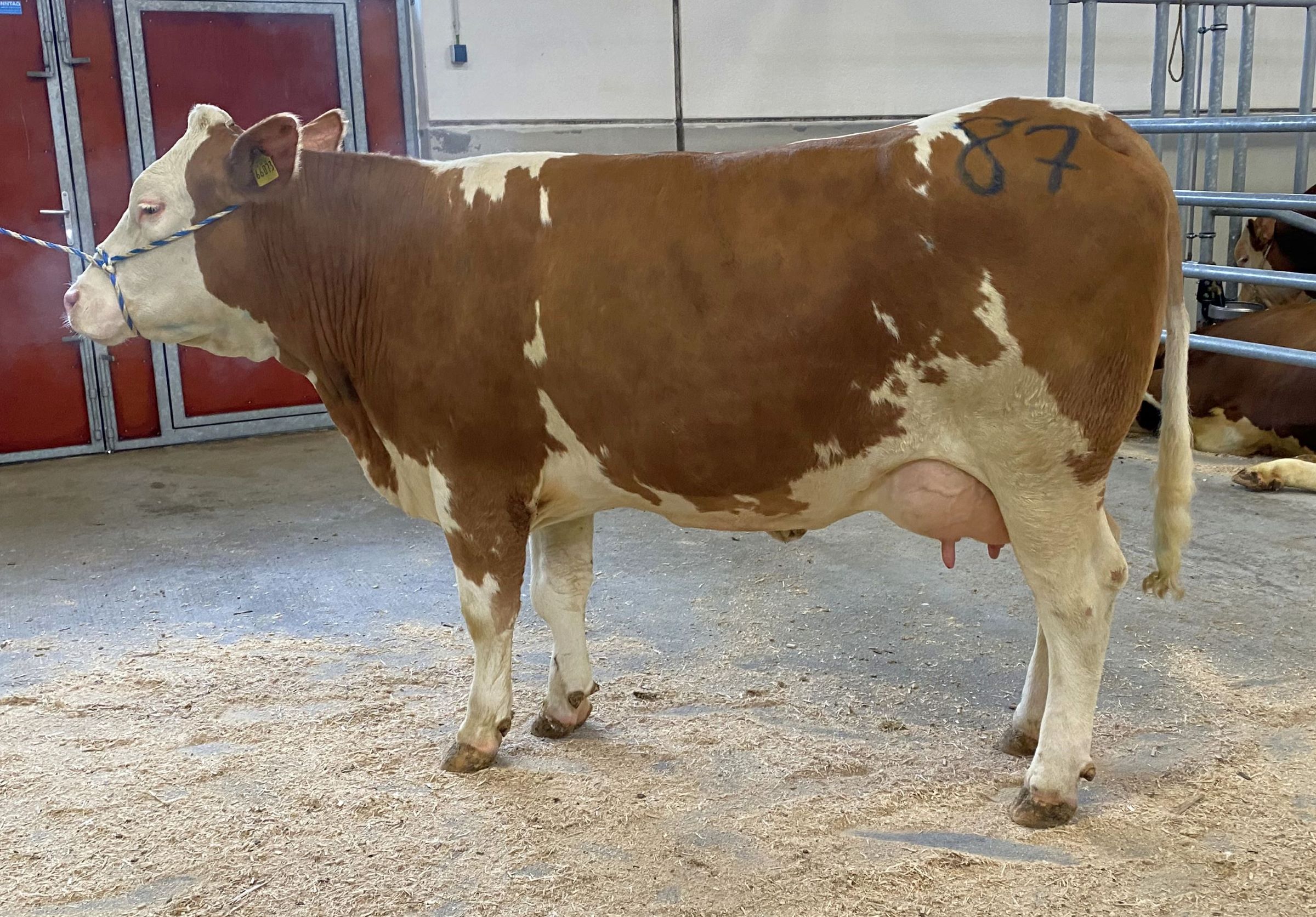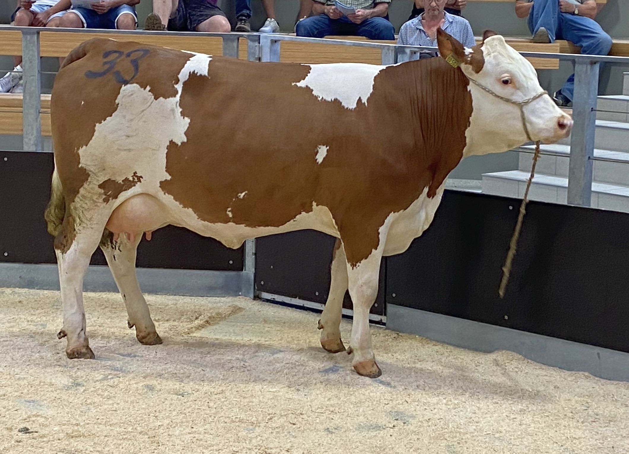 Das Angebot der Jungkühe ist mit 41 verkauften Tieren sehr knapp ausgefallen, so dass nicht alle Käuferwünsche erfüllt werden konnten. Die Jungkuhgruppe überzeugte mit einer durchschnittlichen Tagesmilchmenge von 29,6 kg. Außerdem war die Hälfte der Kühe bereits zweimal gegen die Blauzungenerkrankung geimpft. Mit einem Versteigerungspreis von im Mittel 2.780 € hat das derzeit hohe Preisniveau weiterhin bestand, wobei sich die Preise in einer Spanne von 1.900 € bis 3.940 € bewegten. Die Spitzenjungkuh, eine natürlich hornlose Hotrod P*S-Tochter, stammte aus dem Zuchtbetrieb von Josef-Florian Kraus aus Bärmannsried, Gemeinde Teisnach und wurde für 3.220 € versteigert. Diese feine Jungkuh mit einem Gewicht von 630 kg überzeugte mit sehr korrektem Fundament und sehr hoch angesetztem Euter, sowie einer Tagesmilchmenge von 34,8 kg. Für eine Makay-Tochter mit einem Gesamtzuchtwert von 134 aus der Zuchtherde von Rudolf Hartl aus Stimmberg bei Offenberg wurde der Tageshöchstpreis von 3.940 € geboten.